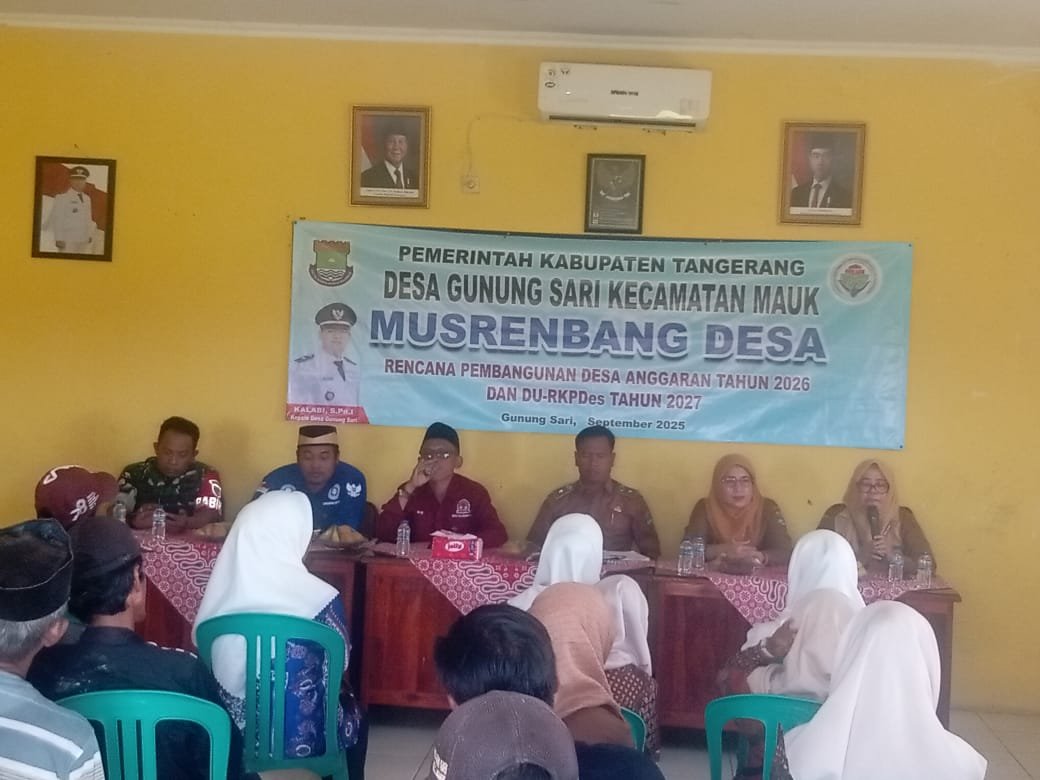 GUNUNG SARI | Komet.News – Pemerintah Desa Gunung Sari, Kecamatan Mauk, Kabupaten Tangerang menyelenggarakan Musyawarah Perencanaan Pembangunan Desa (MUSRENBANGDES) Tahun Anggaran 2026 sekaligus penjaringan Daftar Usulan (DU) RKPDes Tahun 2027, Selasa (30/9/2025), bertempat di aula kantor desa lantai 2.