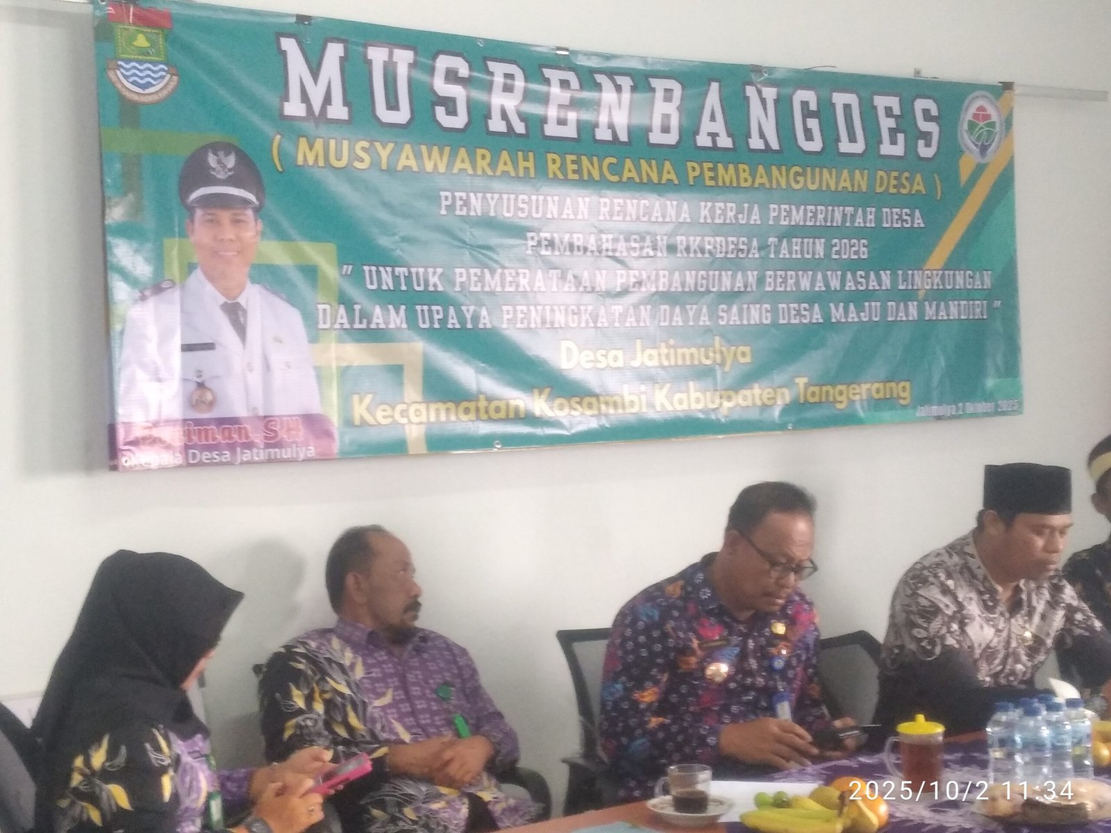 KOSAMBI | Komet.News – Pemerintah Desa Jatimulya, Kecamatan Kosambi, Kabupaten Tangerang, menggelar Musyawarah Rencana Pembangunan Desa (MUSRENBANGDES) dalam rangka penyusunan RKPDes Tahun 2026. Acara berlangsung di aula kantor desa, Kamis, (2/10/2025), dengan tema: